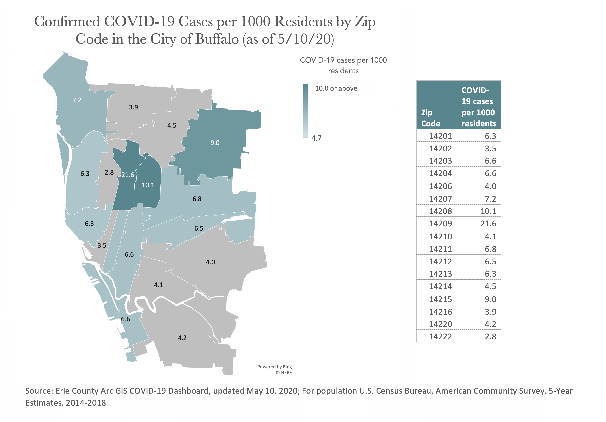 Across Erie County (as of May 10), about 4.8 people per every 1,000 residents had been tested and confirmed as having COVID-19. In these maps, zip codes are marked gray if their COVID-19 positive rate is lower than the county-wide average. The darker teal a zip code is, the higher its rate of COVID-19 positive cases. Of the top ten zip codes with the highest COVID-19 positive rate, five are located within the City of Buffalo (14209, 14208, 14215, 14207, 14211) and five are located elsewhere in Erie County (14052, 14068, 14134, 14227, 14026). That said, most zip codes in the city have a higher COVID-19 rate than the county-wide average, whereas only 19% of zip codes outside of the city do. Zip code 14209 (which encompasses Masten Park, Linwood Avenue, and parts of the Elmwood Village)—has the highest COVID-19 rate far and away at 21.6 cases per thousand residents, more than quadruple the county-wide average.