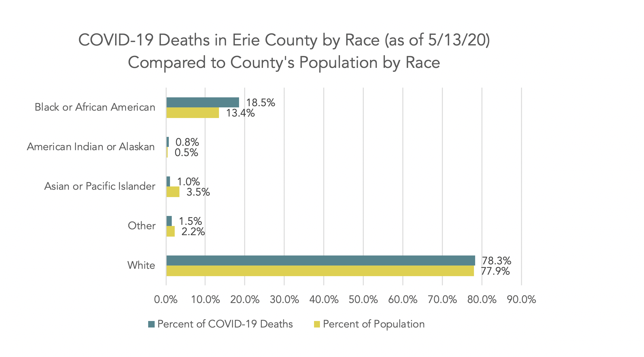 When looking at COVID-19 related deaths across the county, we see that deaths are slightly higher for Black or African American residents than is represented in the county by population.
