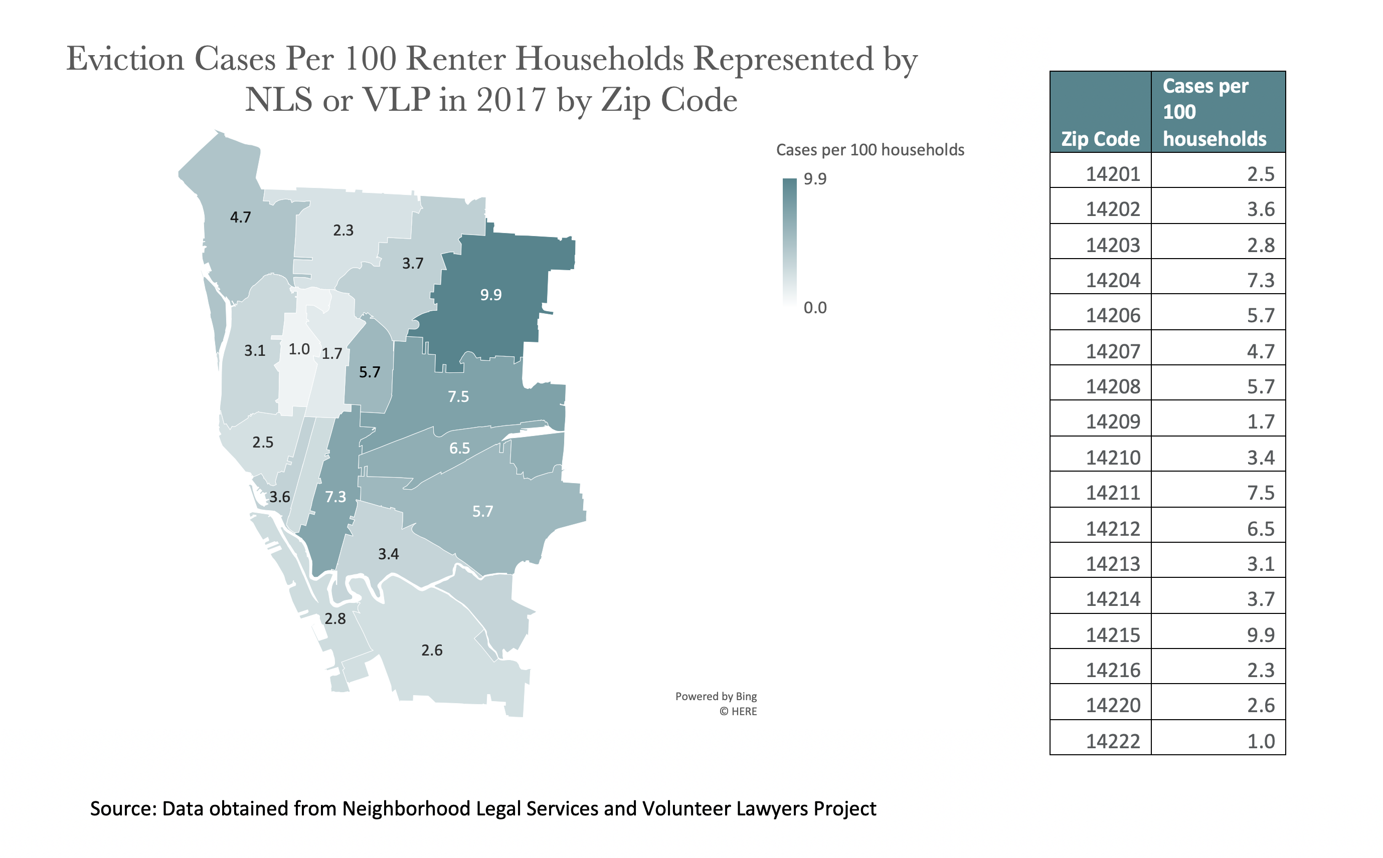 Available data on evictions and water shut offs in the City of Buffalo is limited. For evictions, our dataset includes cases where the tenant appeared in court and was represented by a legal services provider. For water shut offs, our dataset includes only January and February 2019.