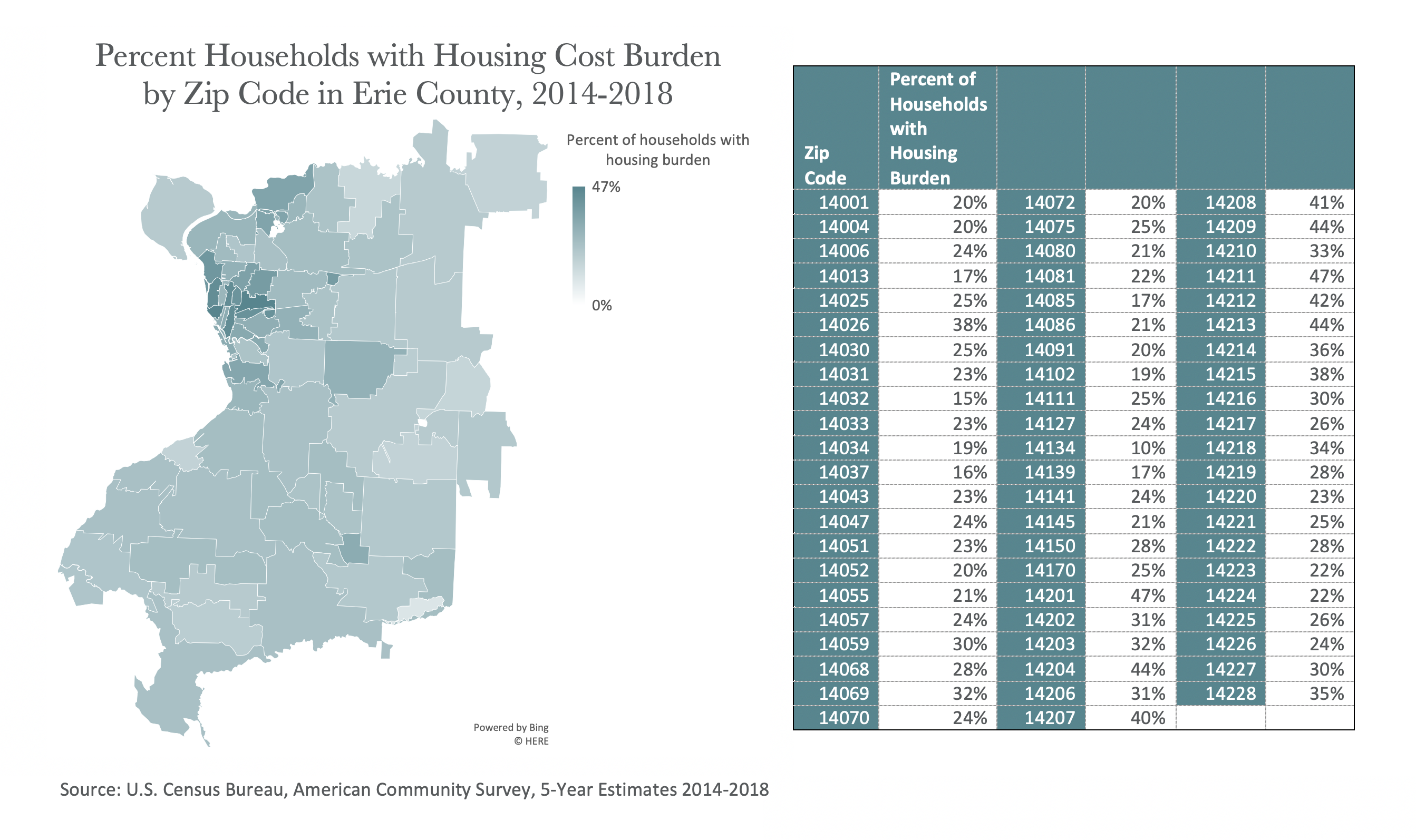 Outside the city, in zip codes with the highest COVID-19 rates, housing burdens vary drastically. Zip code 14026 (Bowmansville) has the highest housing burden 38%, while zip code 14134 (Sardinia) has the lowest housing burden in the county at 10%.