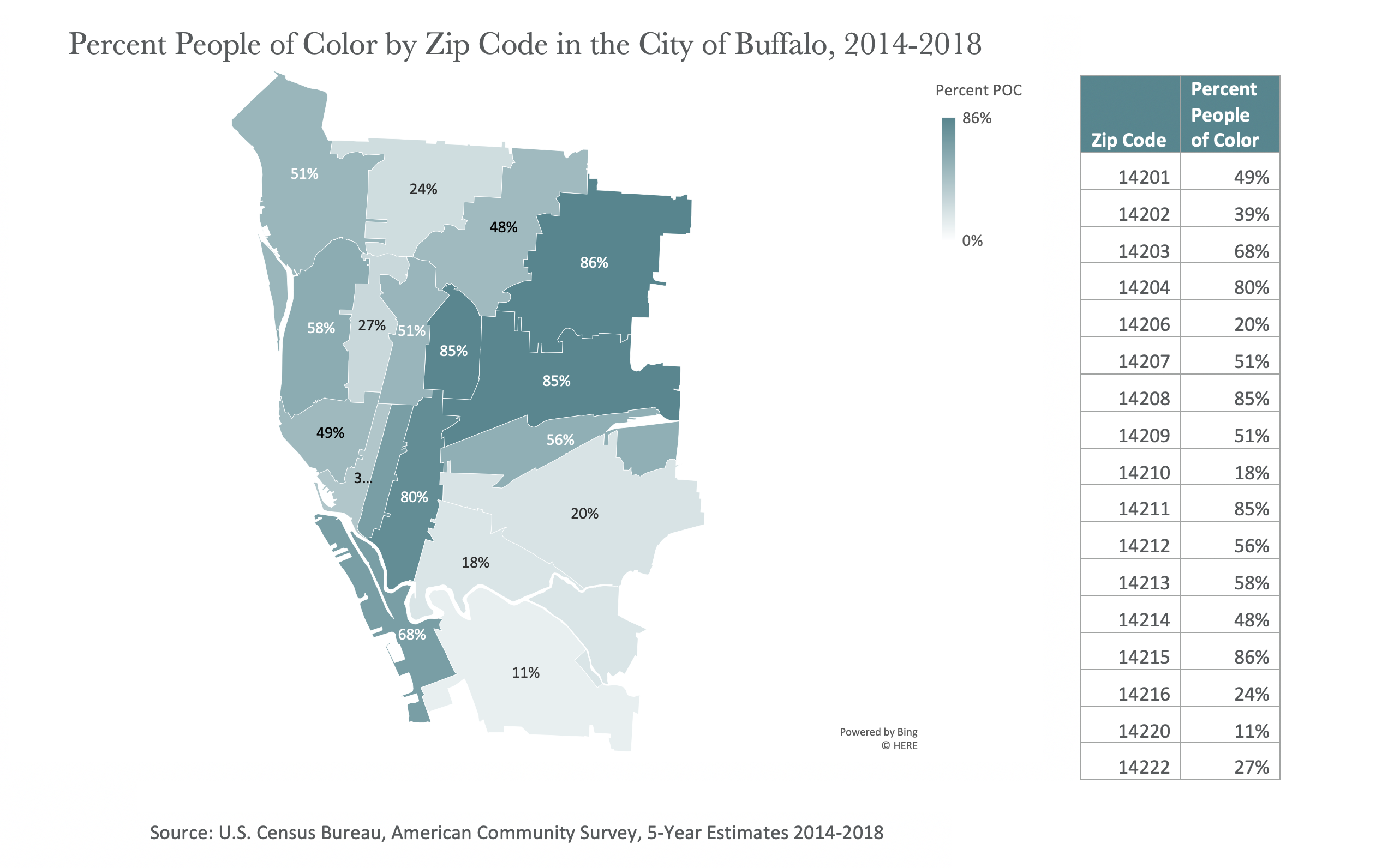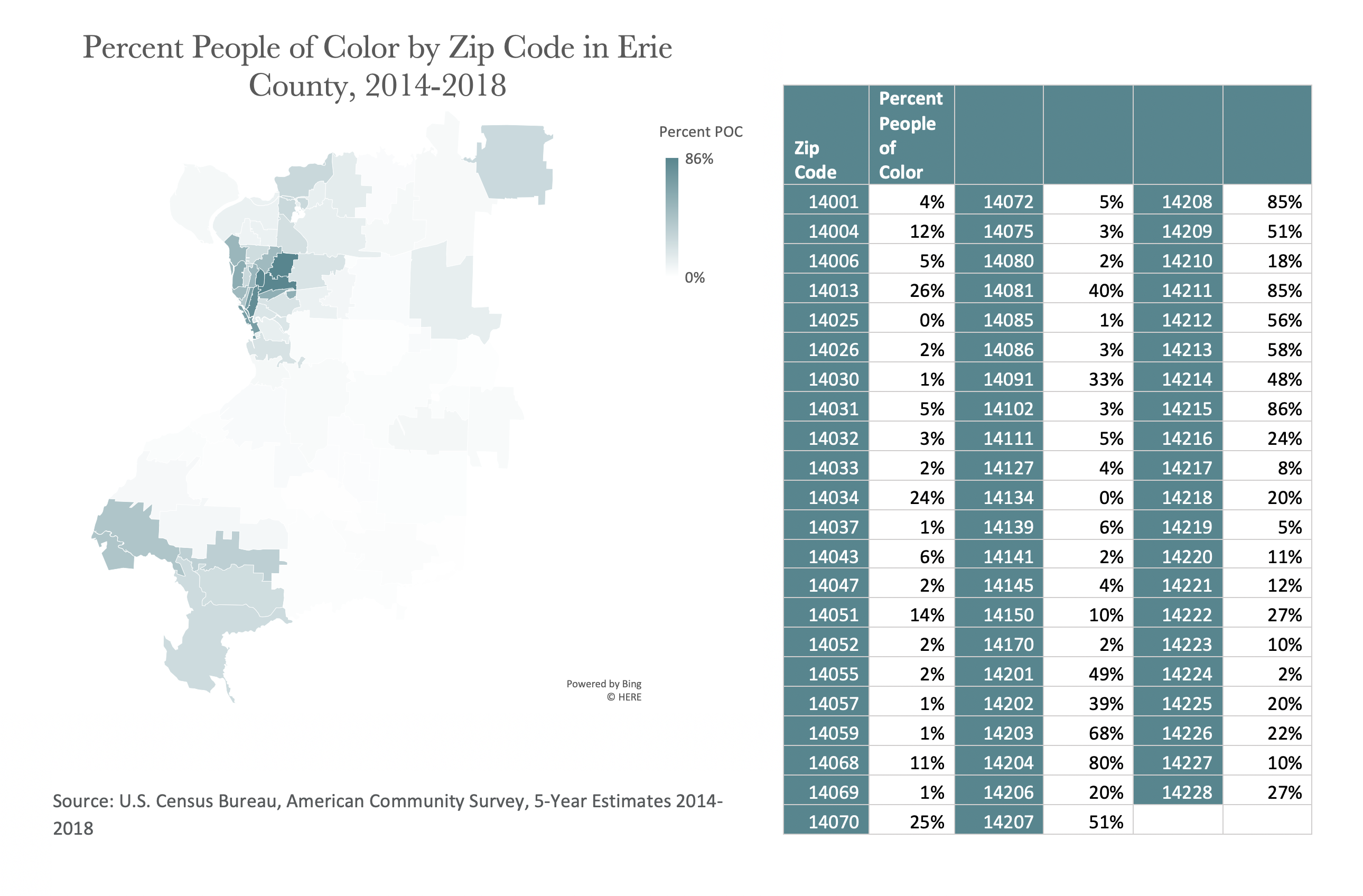 Within Buffalo, the zip codes with the highest rates of COVID-19 have populations that are majority people of color (POC). Interestingly, nearly all zip codes within the City with majority POC populations also have the highest COVID-19 rates of the City. That is, 8 of the 9 zips with majority POC populations have higher COVID-19 rates than the remaining 8 zip codes that are majority white. Outside of the City, zip codes with the highest COVID-19 rates don’t correlate to higher populations of people of color.