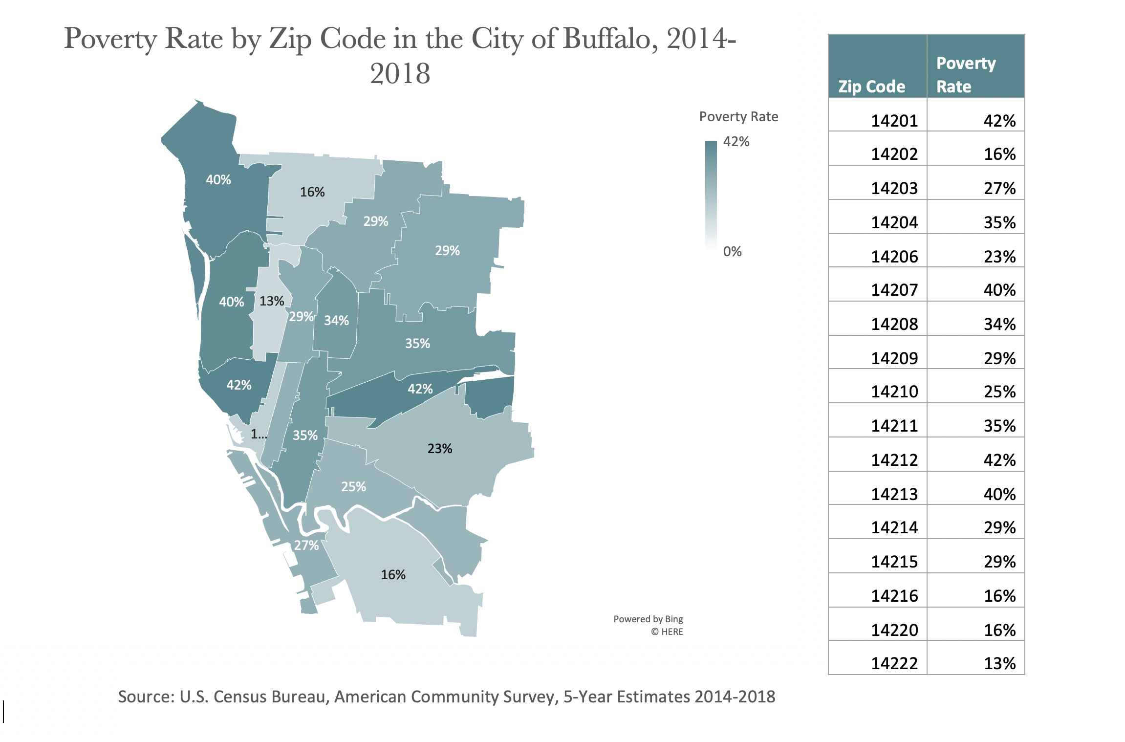 Poverty in Erie County is largely concentrated in the city. In city zip codes with the highest COVID-19 rates, poverty rates range from 29% to 40%. The city-wide poverty rate is 30%. In city zip codes where we see the lowest poverty rates (14222, 14220, 14216, 14202), we also see COVID-19 rates below the county-wide average of 4.8 cases.