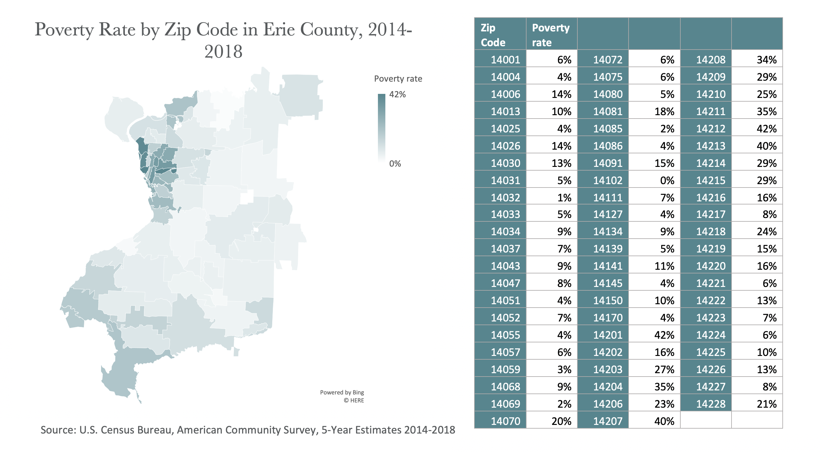 Outside of the city, only one of the zip codes with the highest COVID-19 rates (14026, Bowmansville, 6.8 cases) has a poverty rate that edges close to the county-wide poverty rate of 14.5%. The rest have poverty rates below 10%.
