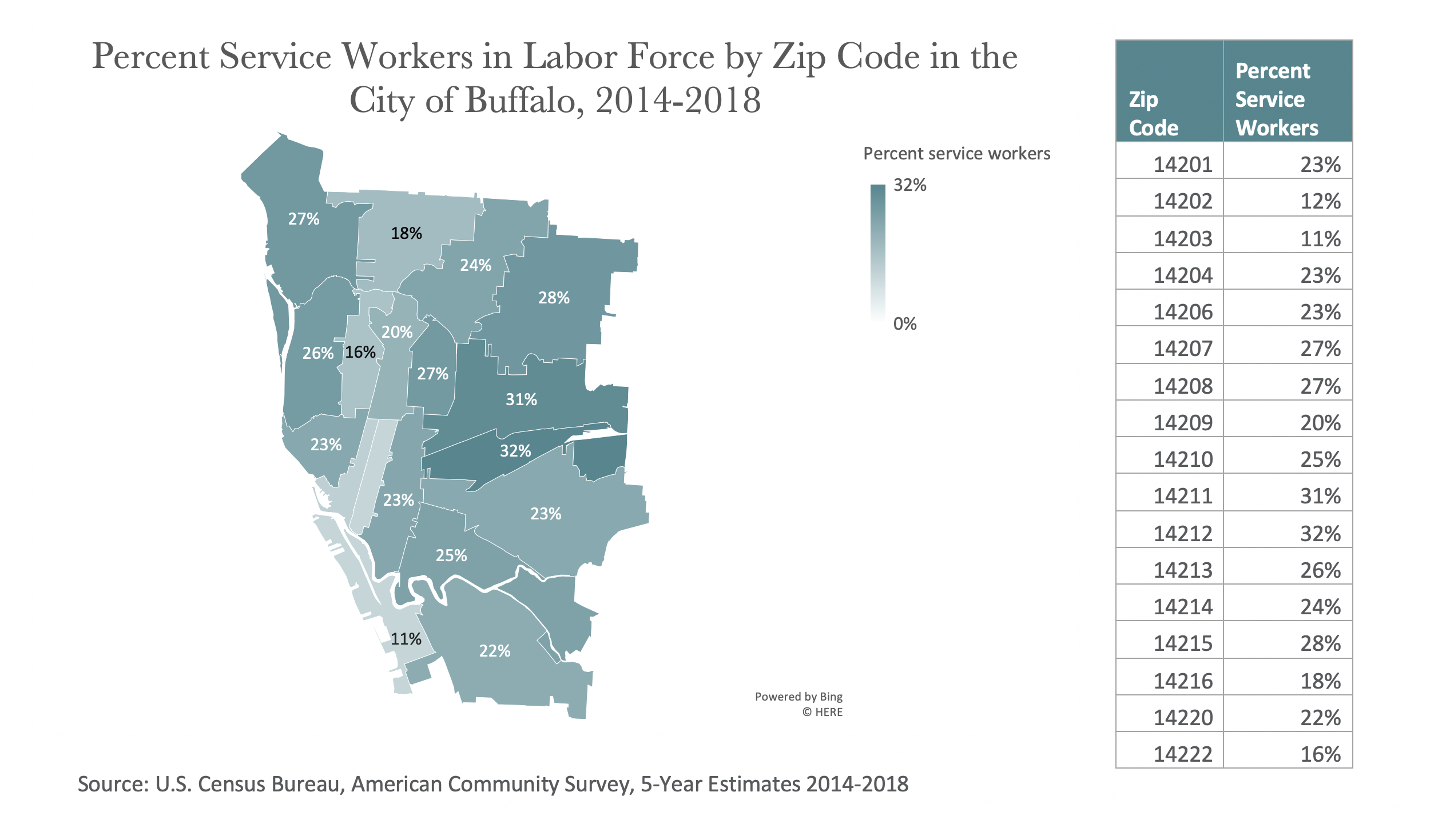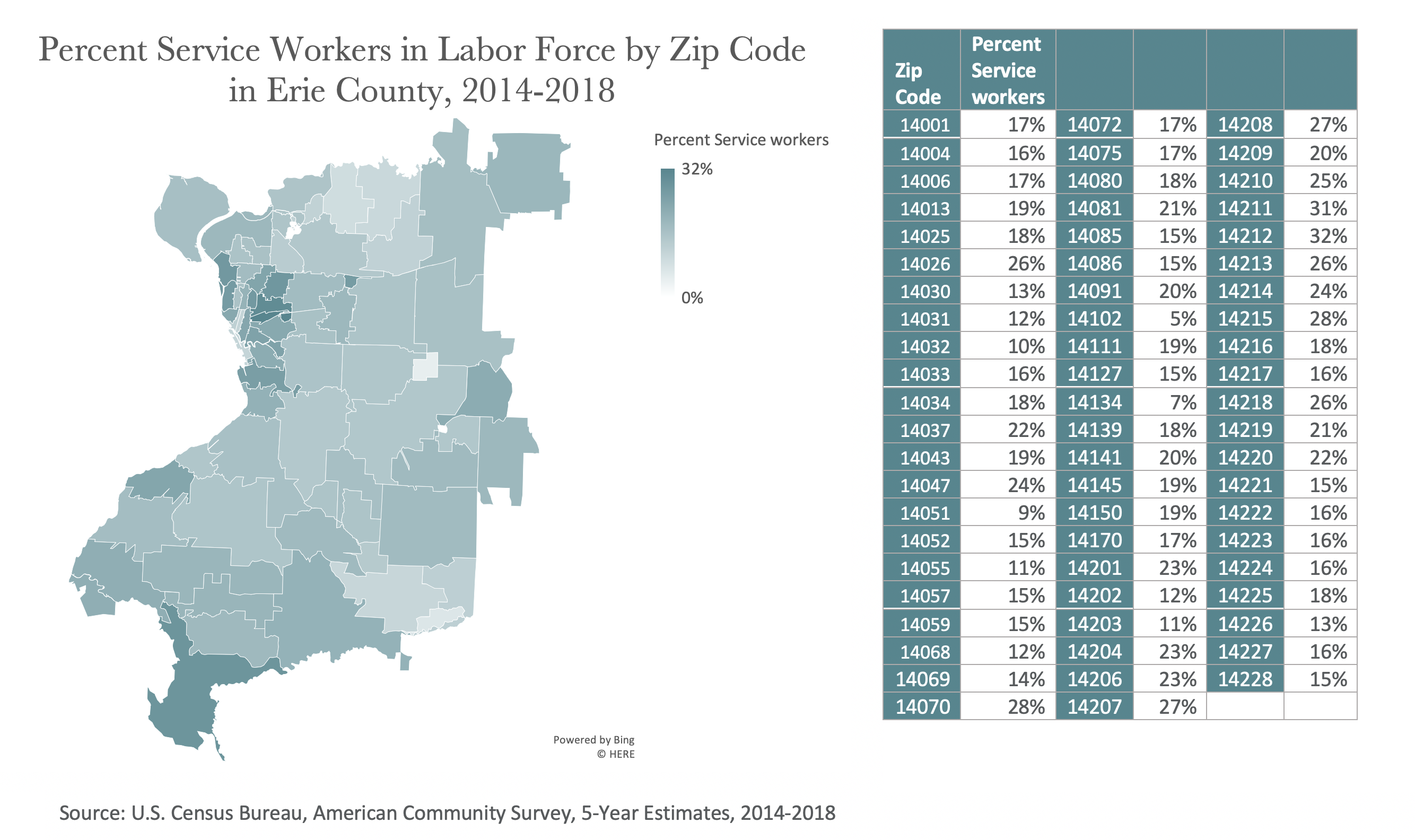 Four of the five Buffalo zip codes with the highest COVID-19 rates also have a population of service workers that is higher than the city average (24%).