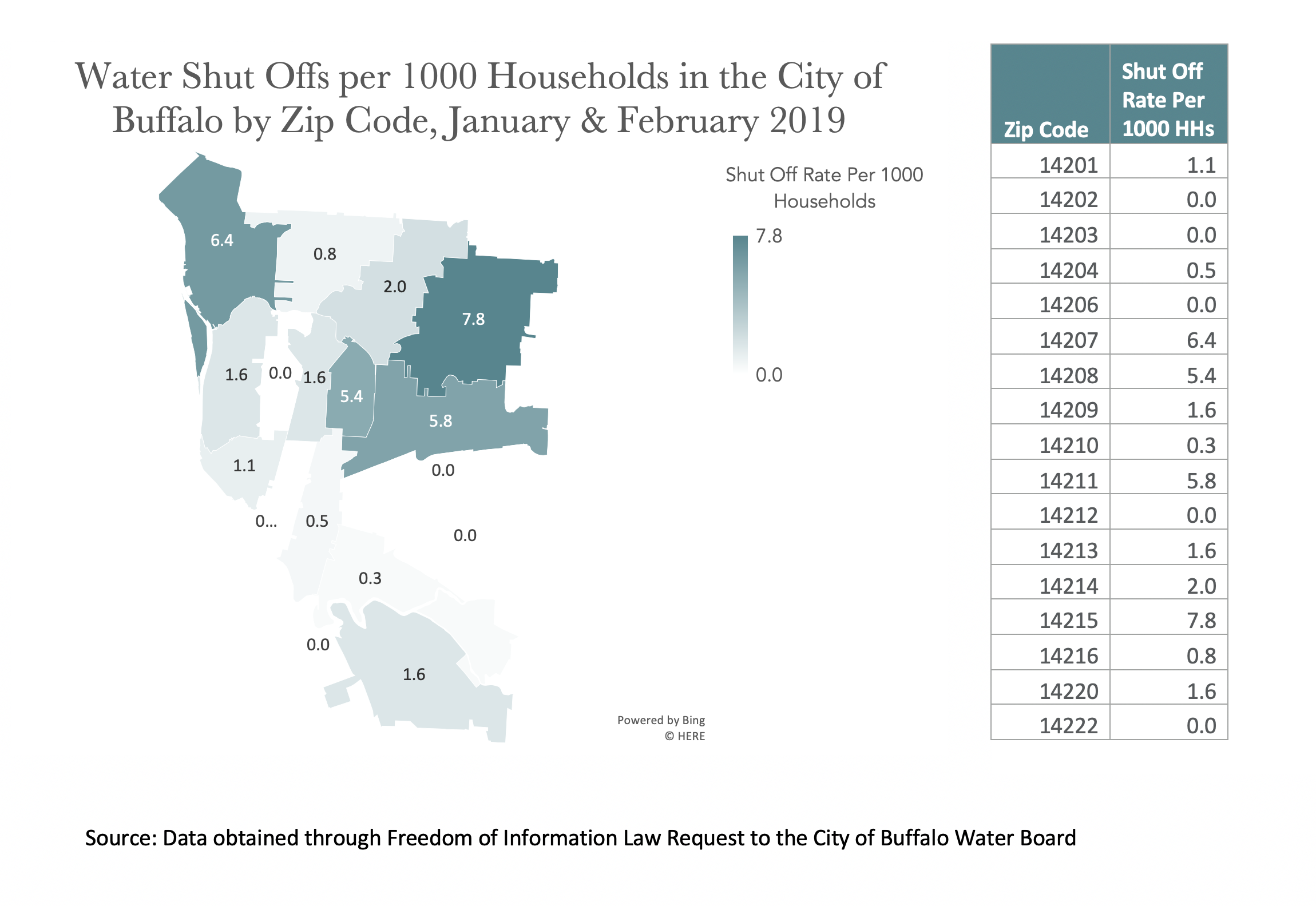 Turning to water shut offs, of zip codes where COVID-19 rates are the highest, the same four of five zip codes have shut off rates higher than the city-wide rate of 2.8 shut offs per 1000 households. These four zip codes (14208, 14215, 14207, and 14211) in fact have the highest shut off rates in the entire city.